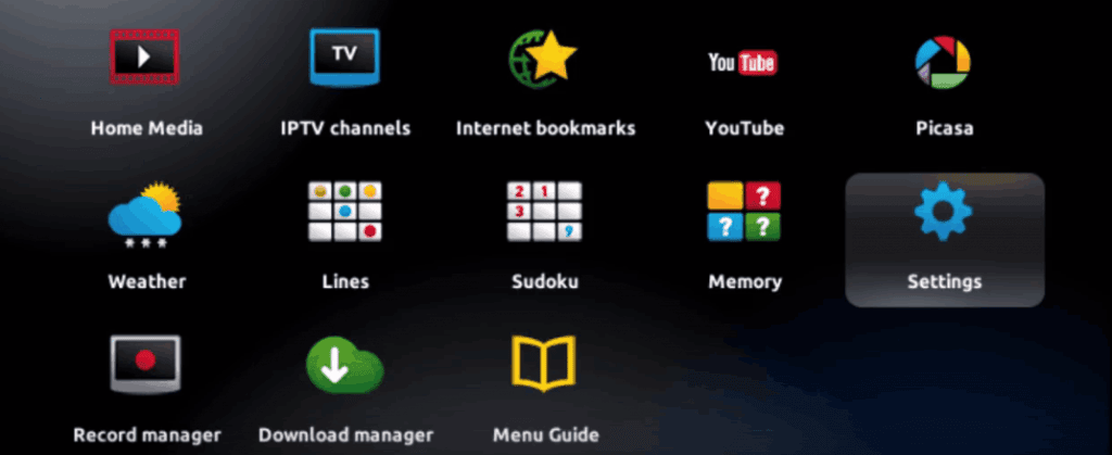 Step 1: When the box is being loaded the main portal screen appears. After that click on “settings”, press remote button “SETUP/SET”